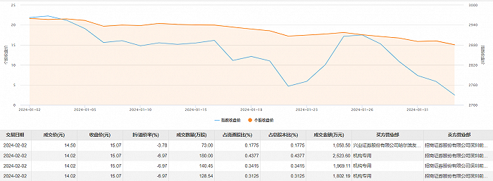 微芯生物2月2日大宗交易成交521.99万股,成交额7353.4万元,占当日总成交额的47.02%,成交均价14.09元,较市场收盘价折价6.5%,其中最高成交价14.5元,最低成交价14.02元。