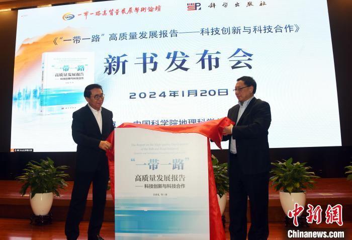 1月20日,“一带一路”高质量发展学术论坛第三届年会在北京举行,作为年会一项重要成果,由白春礼院士领导编著的《“一带一路”高质量发展报告——科技创新与科技合作》重磅首发。图为白春礼院士(左)和科学出版社负责人共同为新书首发揭幕。中新网记者孙自法摄