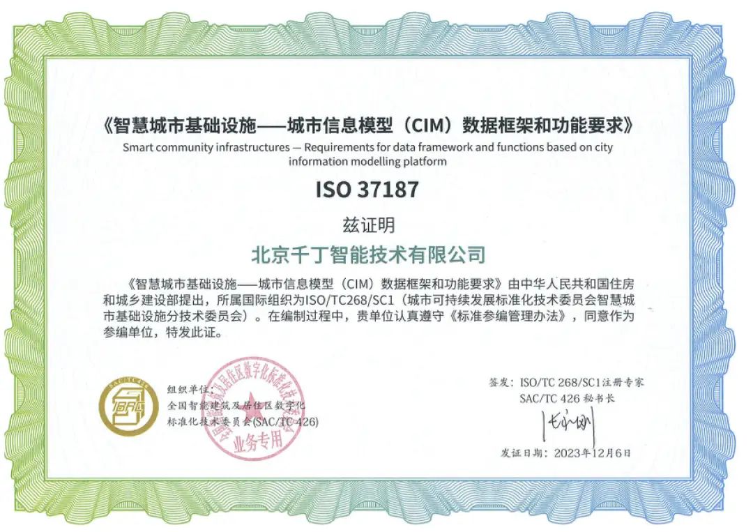 千丁数科成为国际标准ISO 37187《智慧城市基础设施—城市信息模型(CIM)数据框架和功能要求国际标准》参编单位